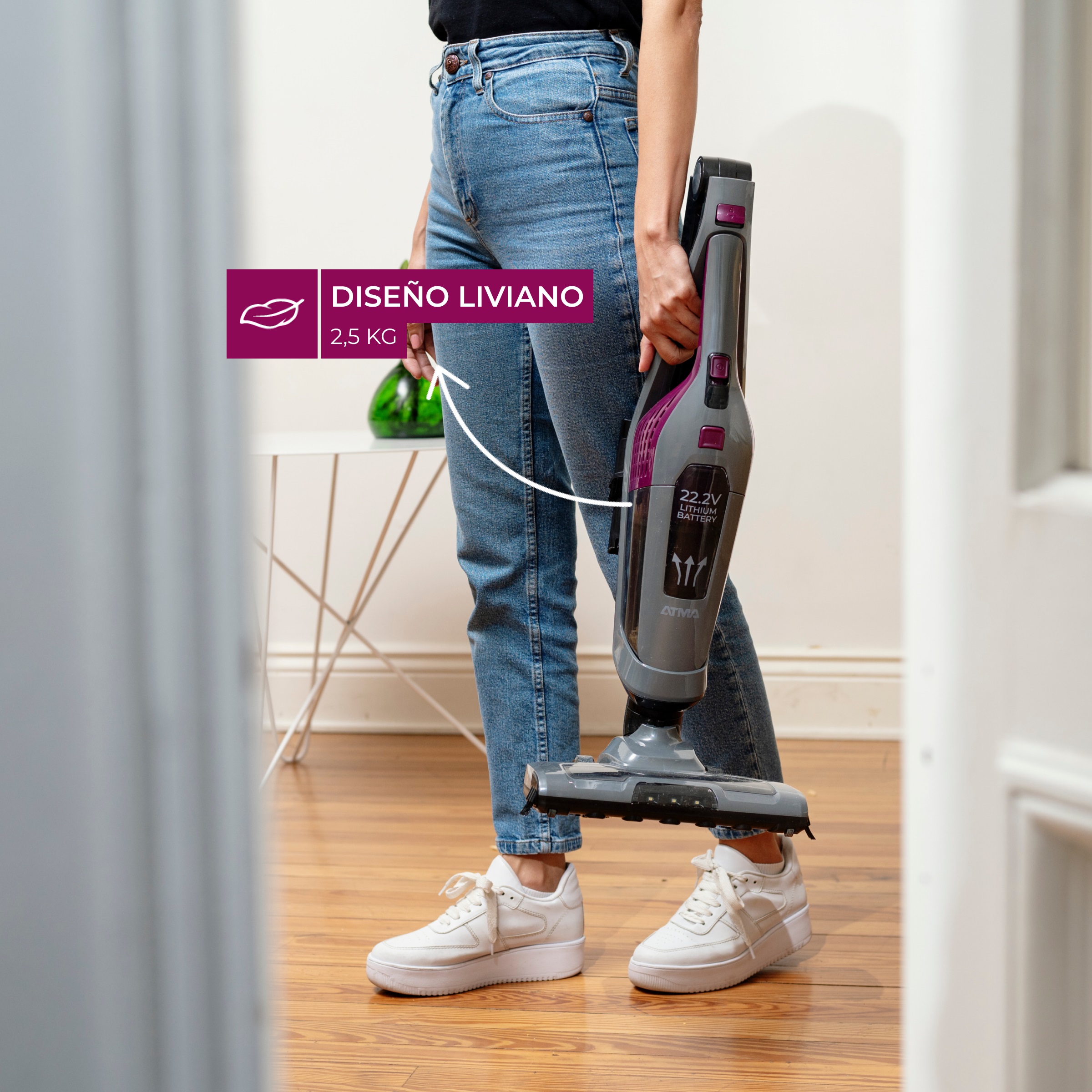 La aspiradora inalámbrica Dual Force Power posee una potencia de 100W y 5000pa de poder de succión . Es ideal para la limpieza diaria. Apta para todo tipo de pisos: duros, blandos y alfombras. Recoge eficientemente la suciedad y te ayuda a mantener tu casa libre de pelos de mascotas. Incluye un accesorio dual ajustable a cepillo redondo para superficies delicadas y boquilla para zonas estrechas para completar la limpieza de todos los rincones de tu hogar.