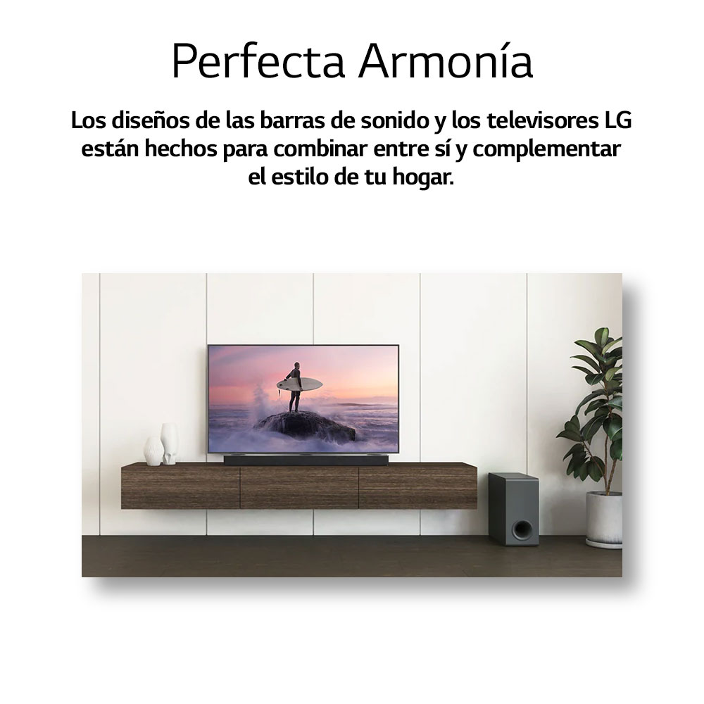 Disfruta de una experiencia de sonido inmersiva con la barra de sonido LG 300W, diseñada para complementar tu LG TV.