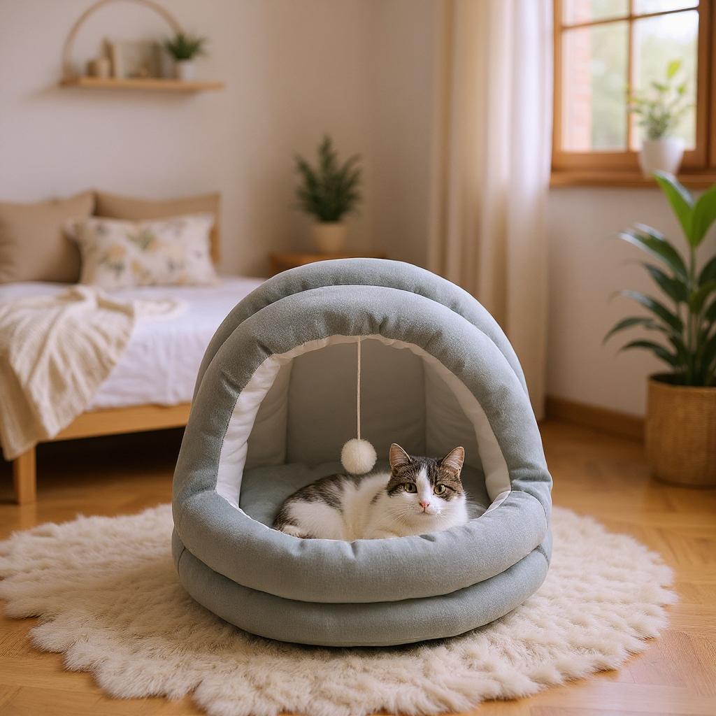 Con su diseño semi-cerrado, tu mascota podrá descansar profundamente mientras se entretiene con la pelota colgante que viene incluida.