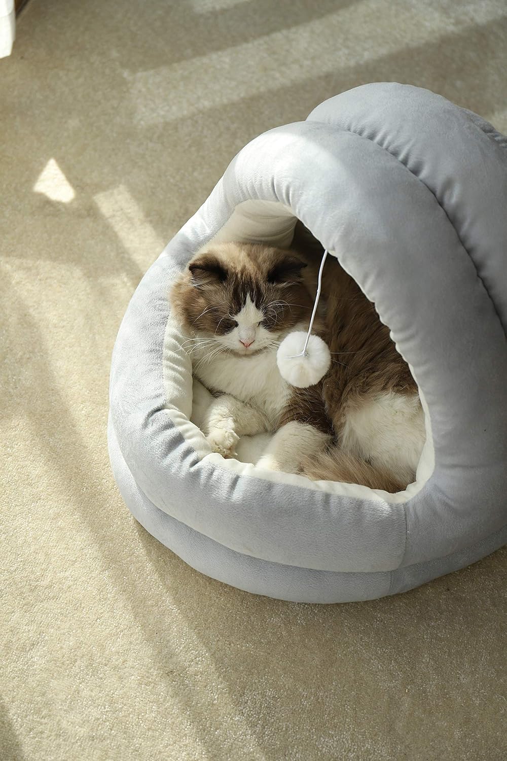 - Su diseño semicerrado y suave acolchado invitan al descanso profundo de la mascota, incluyendo un juguete para su entretenimiento.