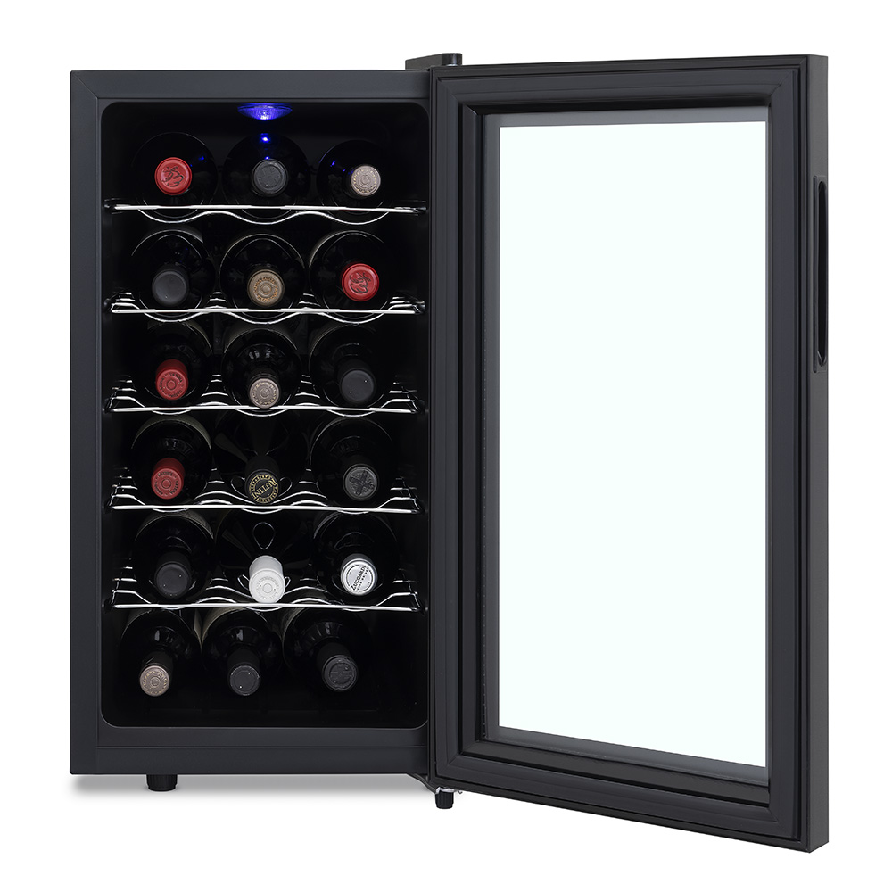 Su panel touch con pantalla LED permite ajustar la temperatura de 10°C a 18°C, adaptándose a distintos tipos de vinos. Los estantes de acero inoxidable brindan resistencia y durabilidad, mientras que la luz interior regulable te ayuda a visualizar tu colección con facilidad.