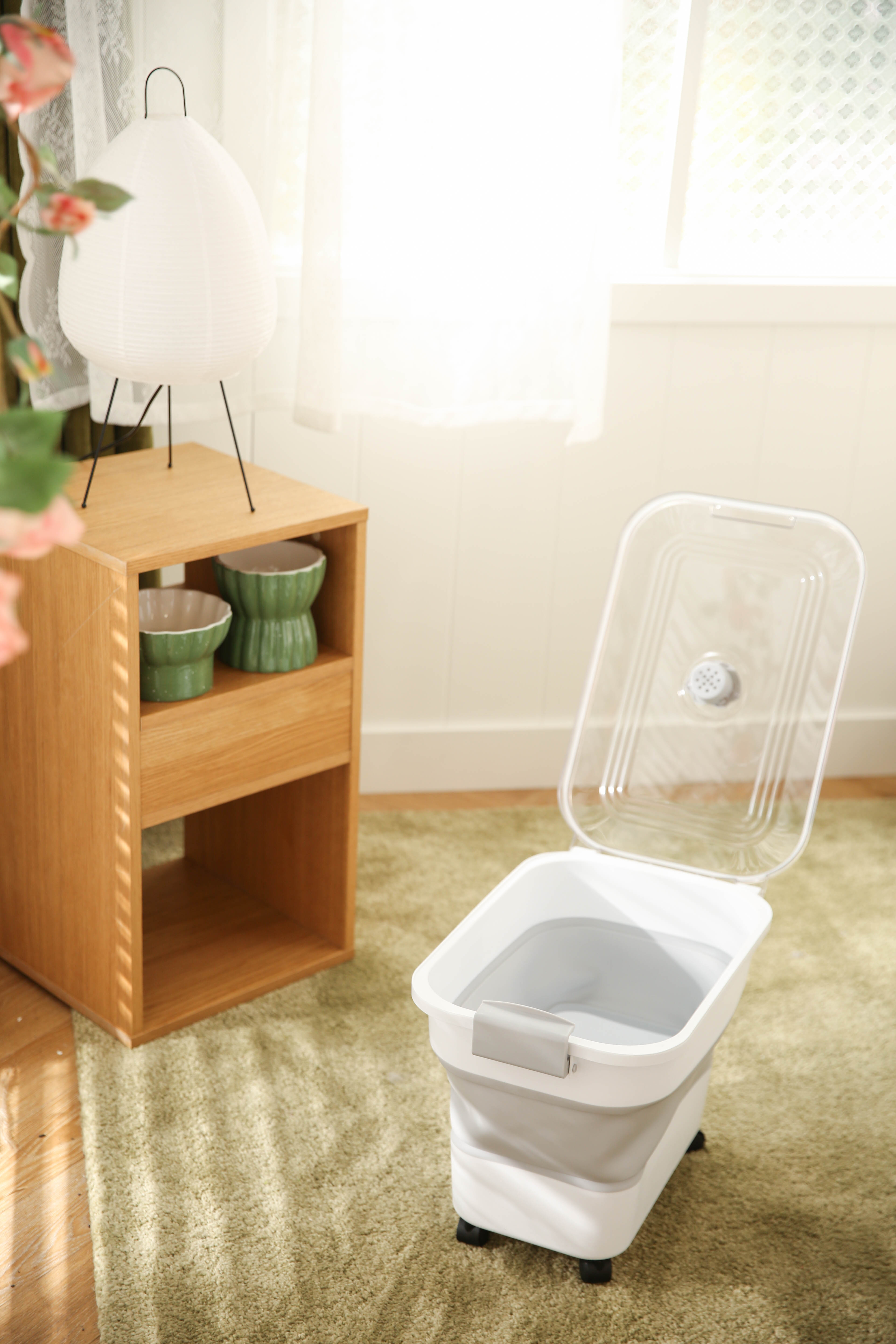 Este innovador sistema de almacenamiento no solo optimiza espacio con su estructura plegable, sino que también mantiene el alimento de tu mascota fresco y protegido gracias a su sello antihumedad. Ya sea que vivas en un departamento o en una casa, este contenedor es el complemento perfecto para tener alimentada a tu mascota y tu espacio ordenado.