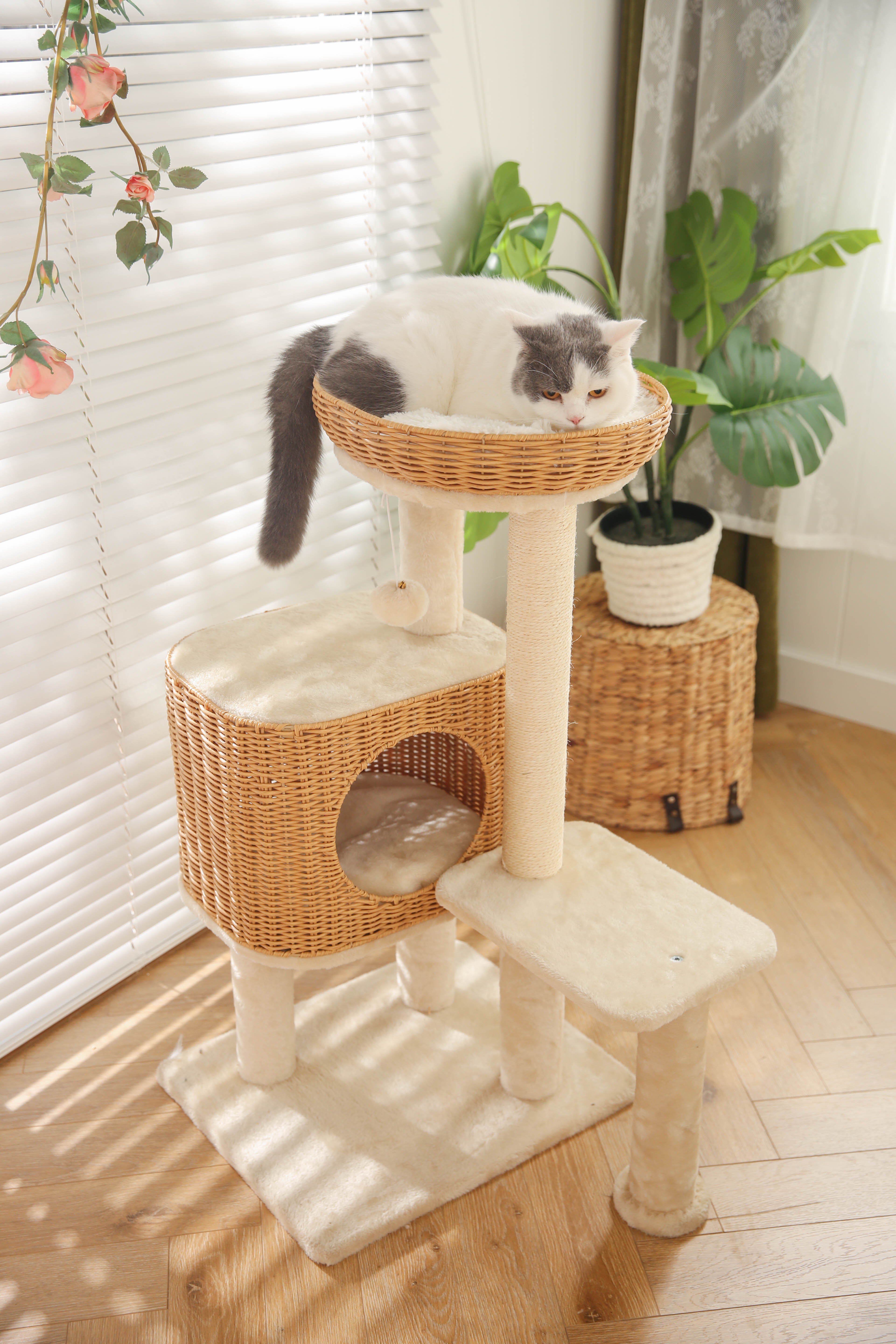 Fabricado con materiales de calidad como el mimbre, sisal y felpa, este árbol es un refugio seguro y entretenido que mantiene a tu peludo feliz y saludable. No más muebles rayados o peluches esparcidos, ¡tu gato se enamorará de su nuevo rincón preferido!