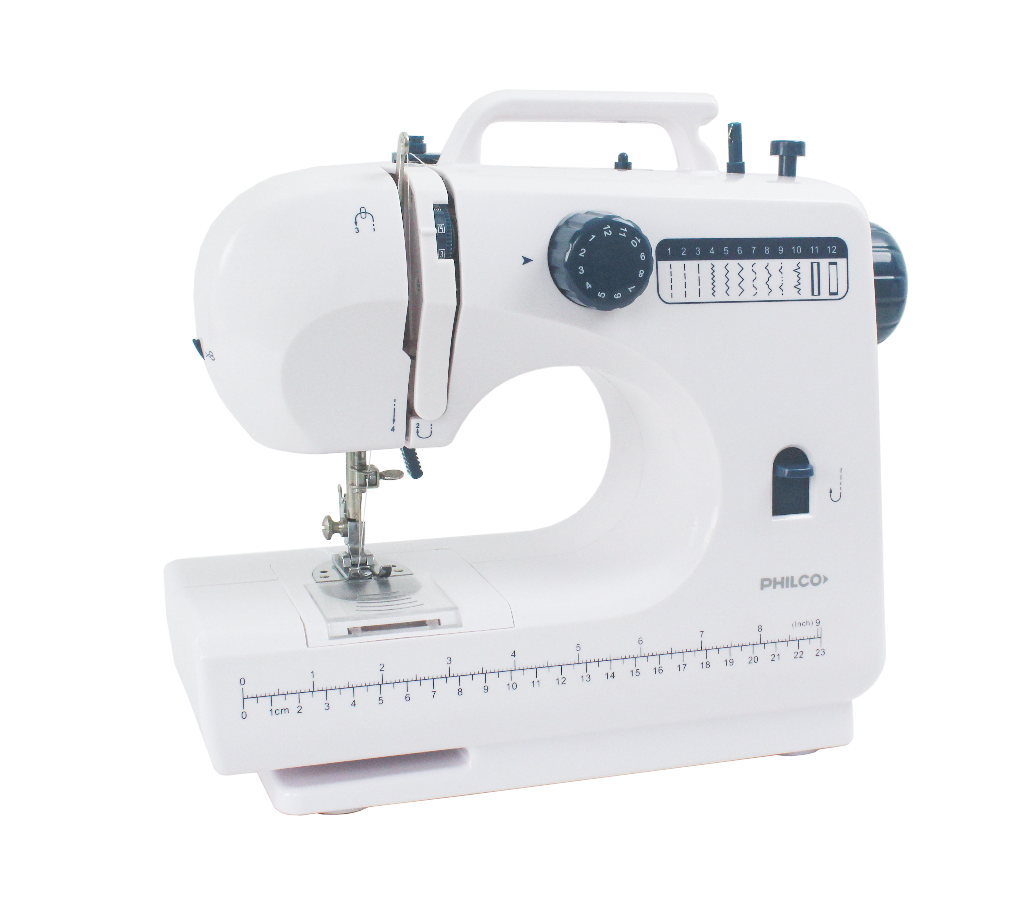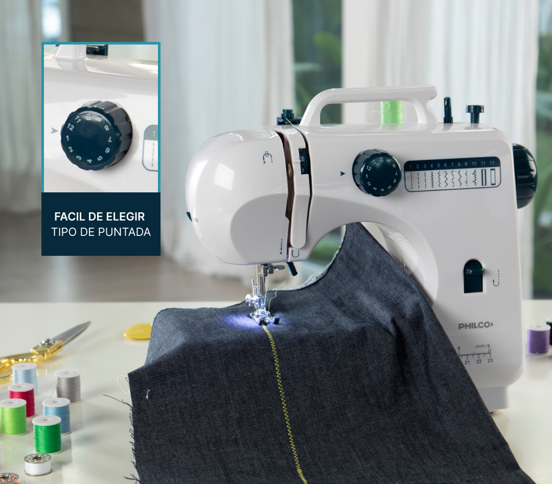 Cortahilos incorporado Tiene brazo libre, esto permite mayor comodidad al coser mangas, puños o costuras tubulares. Tiene 12 tipos de puntadas diferentes y podes ajustar el largo de la puntada lo que te permite hacer costuras más firmes o más sueltas.