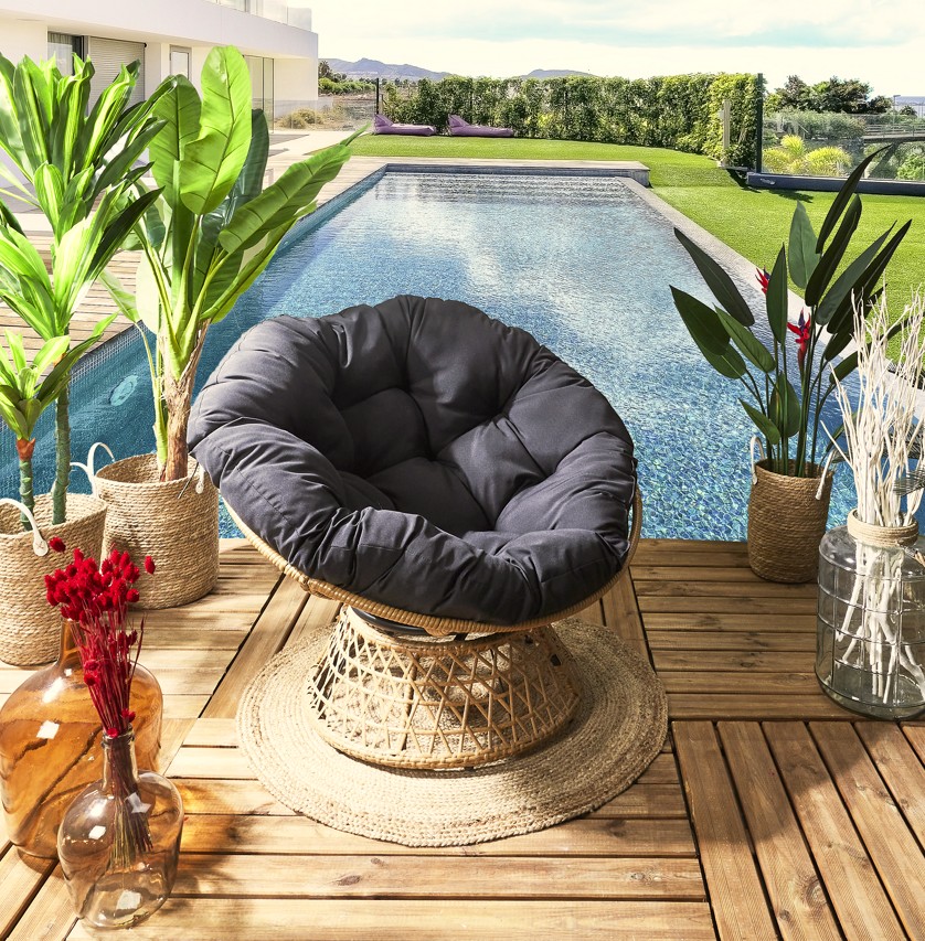 Fabricado con tapizado de poliéster de calidad, su mantenimiento es sencillo y su material lo hace resistente al uso diario. Además, su base giratoria te permite disfrutar de una libertad de movimiento única, ideal para esos momentos de relax mirando una peli o disfrutando de un buen libro al sol. Requiere armado, pero su manual detallado facilita el proceso.