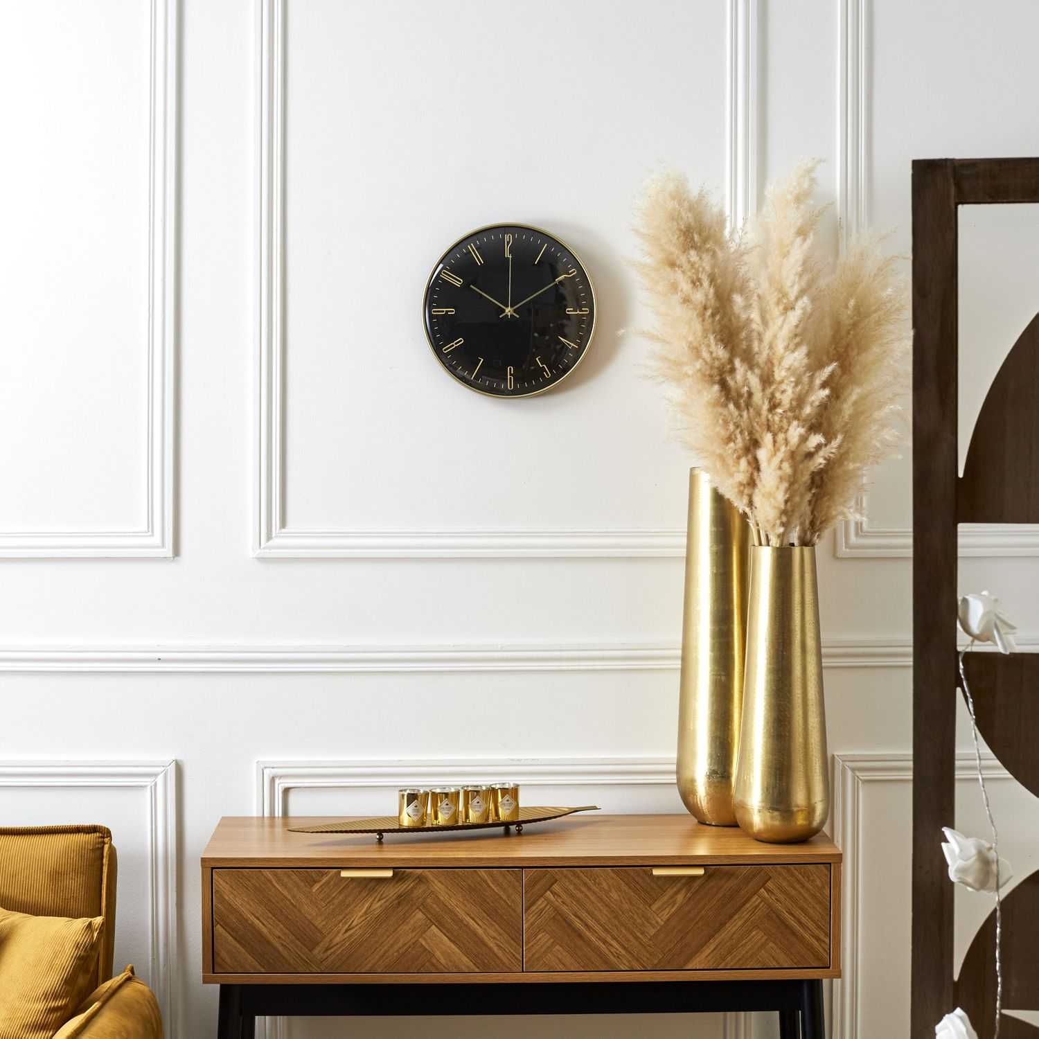 Ideal para tu living, habitación o incluso la oficina, este reloj minimalista y sofisticado se adapta a cada espacio aportando un toque de sofisticación. El contraste entre los colores blanco/negro y dorado le da un aire chic, mientras que su silencioso mecanismo asegura tranquilidad total.