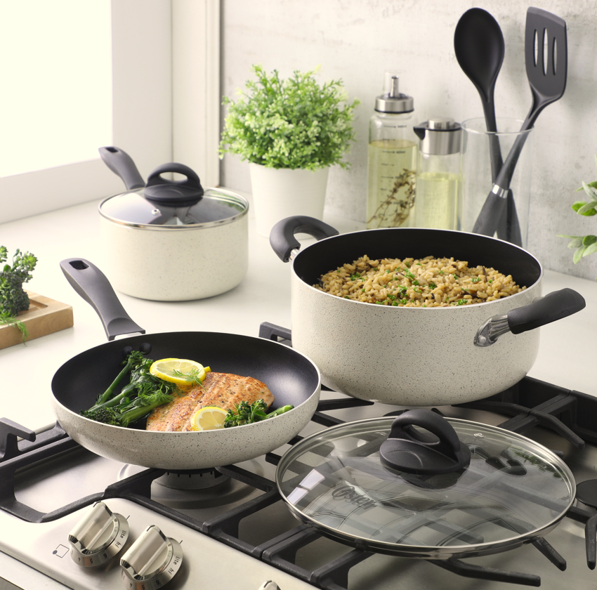 ¡Cociná como un profesional! Incluye una olla de 4,7L, una cacerola de 2,4L, una sartén de 24 cm, y un juego de utensilios (cuchara y espátula) para completar tus habilidades culinarias. La válvula de vapor en las tapas asegura que tus platos mantengan todo su sabor y jugosidad.