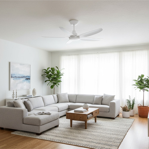 Perfecto para espacios cálidos, este ventilador no solo refresca, sino que también ilumina con su luz integrada. Sus 5 aspas blancas de material ABS aseguran un flujo de aire constante y silencioso, mientras disfrutás de su estilo moderno y elegante.